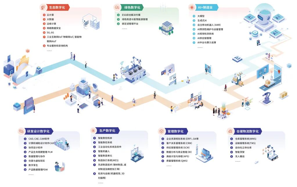 從管理數字化(ERP、CRM等系統)、生產數字化(智能機床、工業機器人等)到綠色數字化(ESG解決方案、碳足跡管理等),涵蓋研發設計、生產制造、倉儲物流等全環節,全方位展示數字化轉型成果。